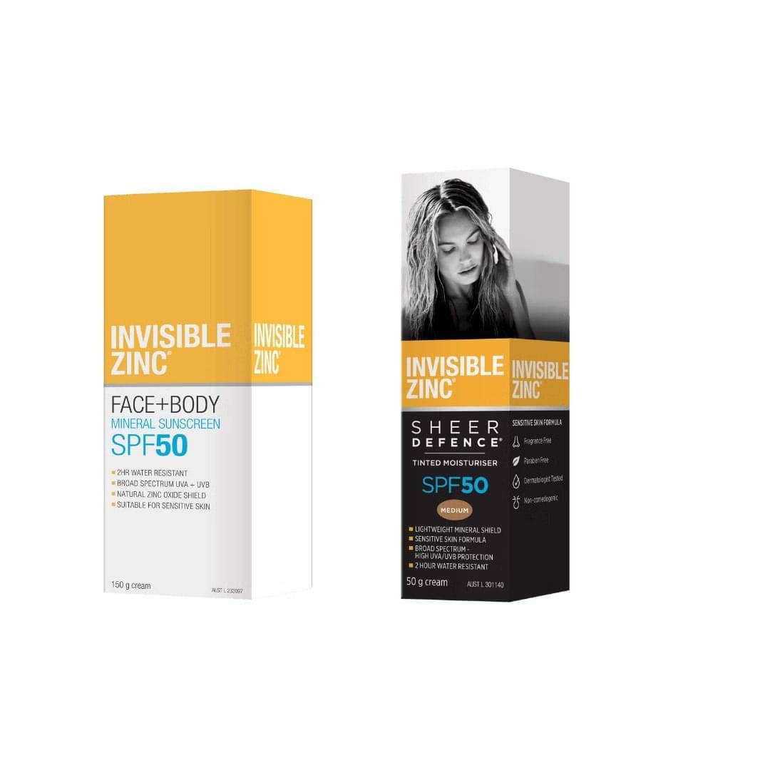 The Invisible Zinc Sheer Defence Tinted Moisturiser range is a lightweight formula that is non-comedogenic and is ideal to use every day on the face, with or without makeup. Available in Light or Medium tints or Untinted (rubs in clear). Its broad spectrum SPF50 formulation is 2 hours water resistant and is ideal for sensitive skin and all skin types. It is fragrance and paraben free.